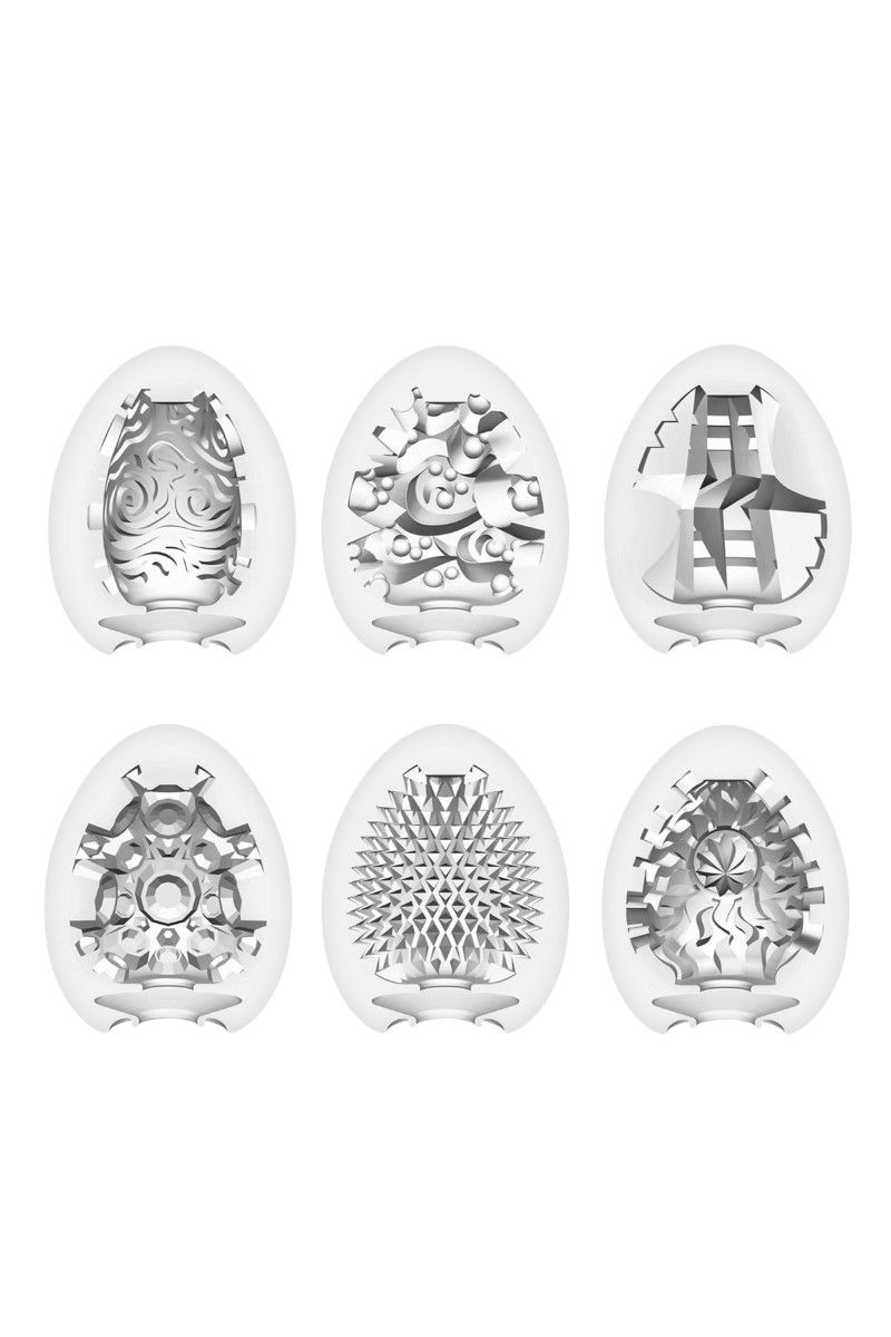 В прозрачной пластиковой упаковке этого набора полдюжины яиц, но не простых, а волшебных. Под каждой пластиковой скорлупкой – нежное содержимое, способное экстремально растягиваться и покрывать собой, как второй кожей, ваш член снизу доверху. Между собой они отличаются лишь внутренним рельефом: шипики у Misty, молнии у Thunder, кратеры у Crater, завихрения у Cloudy, лучики у Shiny и волны у Surfer. Выбирайте любое, чтобы погрузиться… и в смазанное лубрикантом яйцо, и в удовольствие! Размер яйца - 5,3 х 5,3 х 7 см.