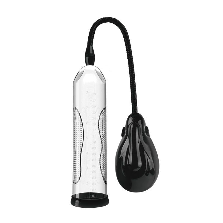 Вакуумная помпа, выполненная из прозрачного материала с уплотненной манжетой черного цвета, которая плотно обхватывает половой член, создавая полную герметичность. Воздух откачивается при помощи вакуумного шланга удобным механизмом откачки. Давление в колбе сбрасывается при помощи кнопки, расположенной на верхней части самой колбы. Длина колбы - 24,5 см, диаметр - 7,3 см.