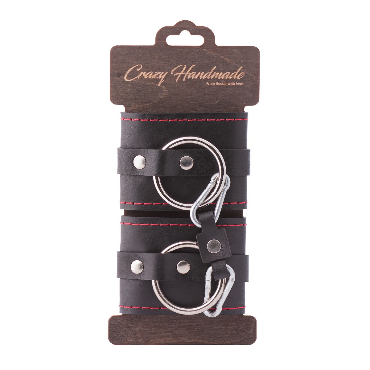 Наручники состоят из одного слоя натуральной кожи, одного ремешка и стального кольца. По краям прошиты декоративной строчкой красного цвета. В комплекте соединительный элемент из кожи с двумя карабинами. Универсальные, подойдут и для использования в любовных играх, и в качестве аксессуара для дополнения образа. Общая длина - 28 см. Длина манжеты - 18,5 см, ширина - 7 см. Обхват - 19-27 см.