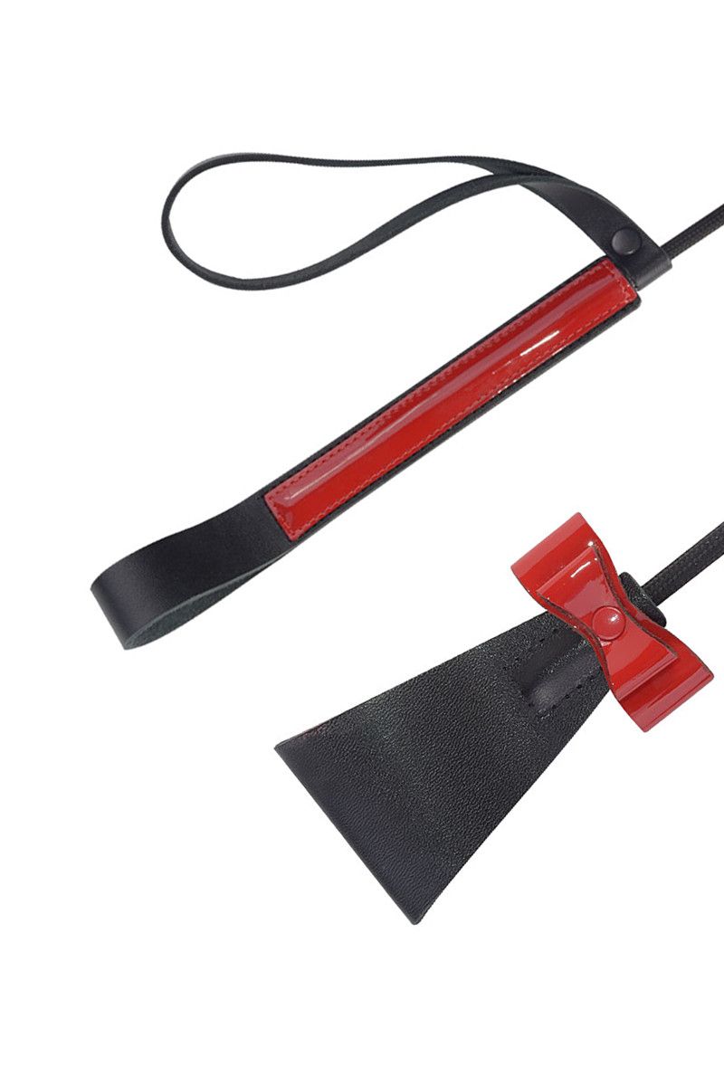 Основа стека - гибкий и прочный углепластик с нейлоновым плетёным покрытием. Гладкая и удобная цилиндрическая рукоять обтянута черной кожей с красной вставкой и имеет удобную черную кожаную петлю для фиксации изделия на запястье (темляк). Окончание-хлопушка выполнено в виде сложенной полоски из плотной натуральной высококачественной кожи черного цвета, украшенной контрастным красным лаковым объемным бантом.