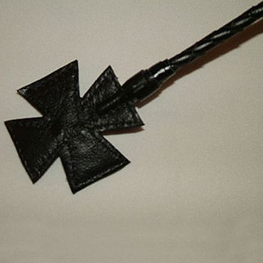 Стек состоит из гибкой основы,овитой натуральной кожей черного цвета,наконечника-креста и удобной рукояти с петлей для надевания на руку (темляк).