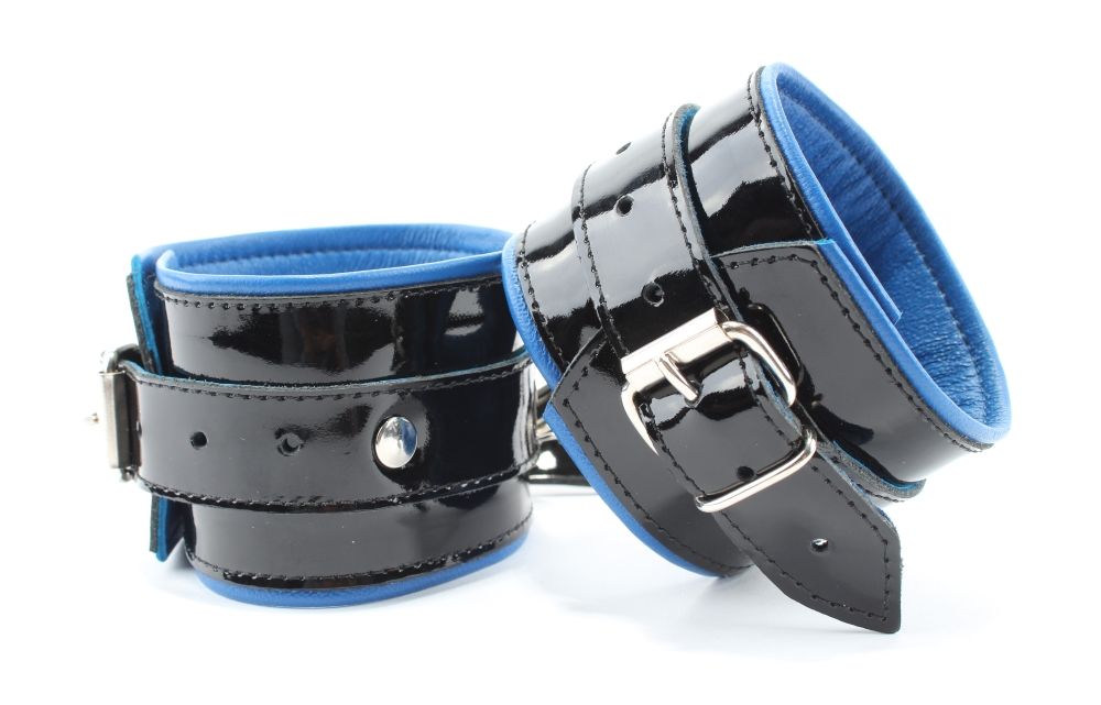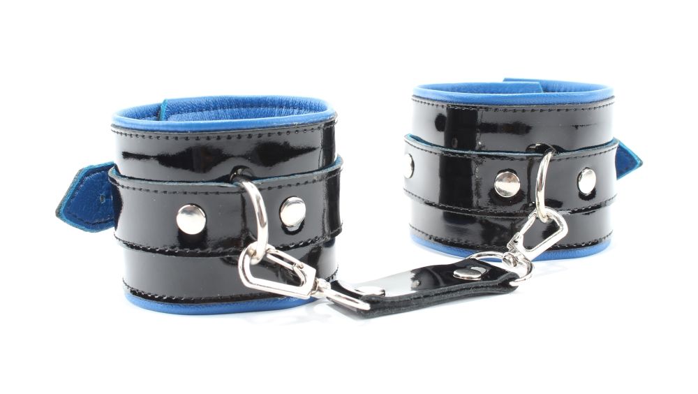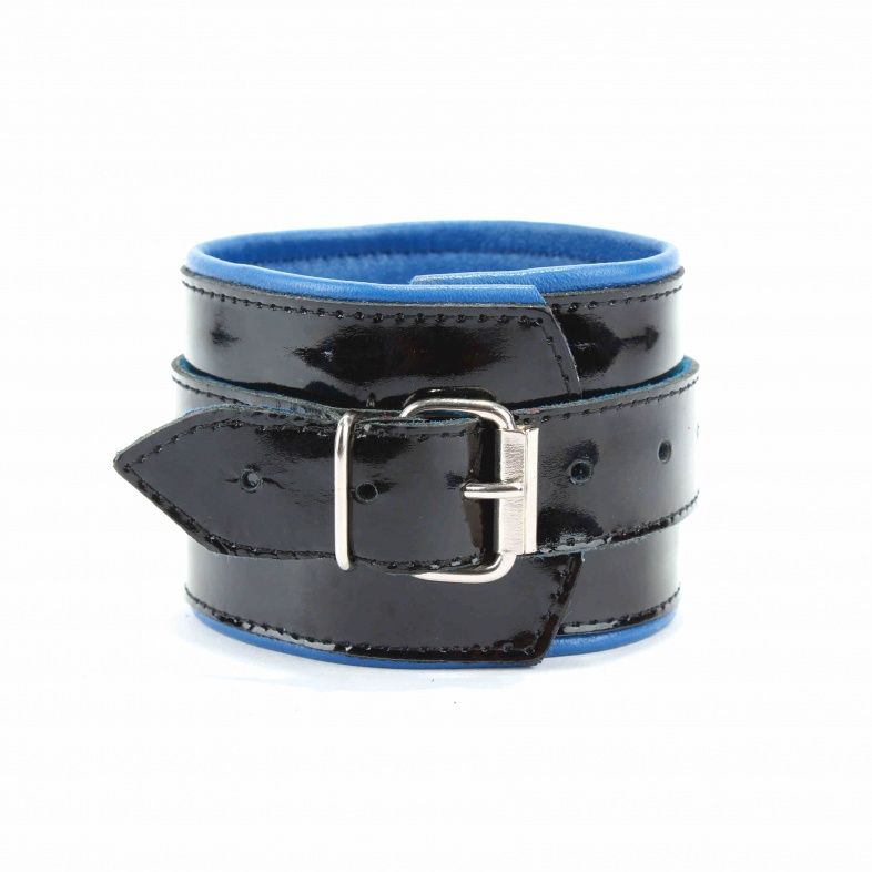 Наручники из натуральной кожи с лаковым покрытием, Подклад из нежной кожи контрастного синего цвета. Сварная металлическая фурнитура и цельный хлястик для надежной фиксации. Ширина - 6 см.