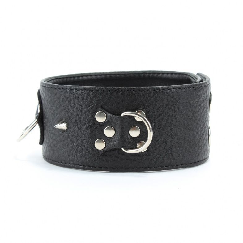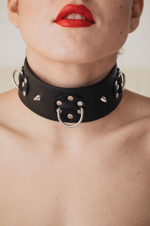 Чёрный кожаный ошейник с кольцами и клёпками.