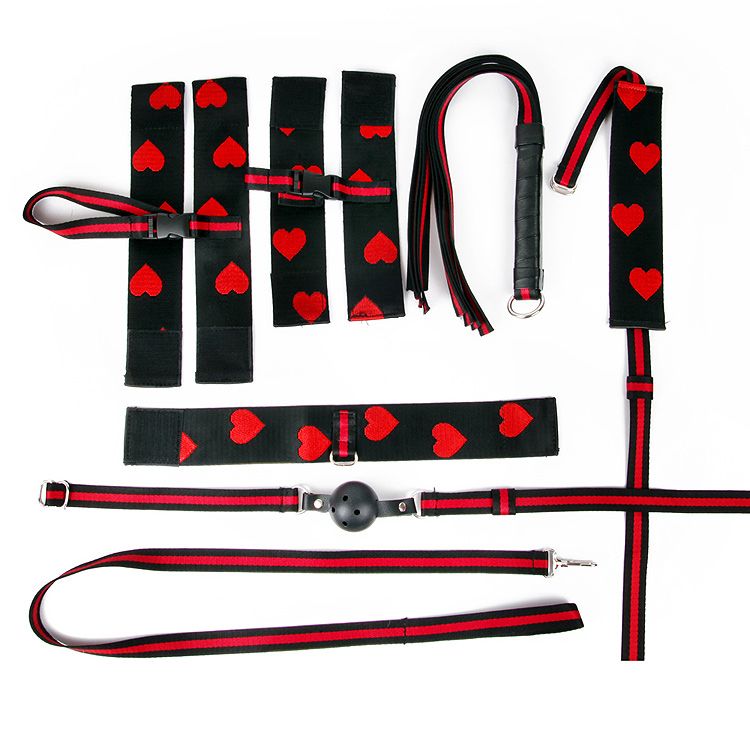 Великолепный набор аксессуаров для любителей БДСМ. Изделия имеют возможность регулирования размера. Кляп оснащён шариком с отверстиями для дыхания. Поверхности наручников, оков, ошейника и маски украшены красивыми сердечками. Плеть-флогер состоит из хвостов и удобной рукоятки, снабжённой петлёй для подвешивания на крючок. В комплекте: наручники, оковы, ошейник с поводком, плеть, кляп, маска, сбруя. Длина плети - 45 см.