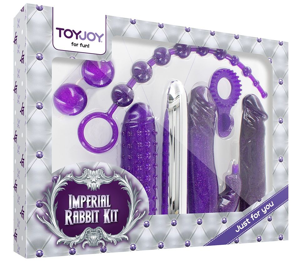 Набор фиолетовых стимуляторов Imperial Rabbit Kit. Cостоит из классического пластикового вибратора серебристого цвета, гибкого фаллоимитатора, насадки на вибратор со стимулятором клитора, насадки с пупырышками, которую можно использовать с вибратором или как насадку на член, эрекционного кольца со стимулятором клитора, анальной цепочки и вагинальных шариков. Длина вибратора - 19 см., диаметр - 3 см. Длина фаллоимитатора - 17 см., диаметр - 3,5 см. Длина анальной цепочки - 26 см. Диаметр вагинальных шариков - 3 см.