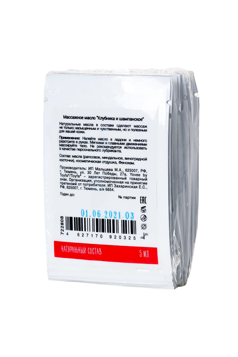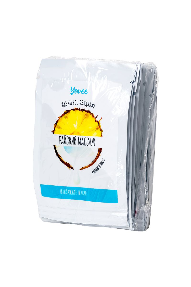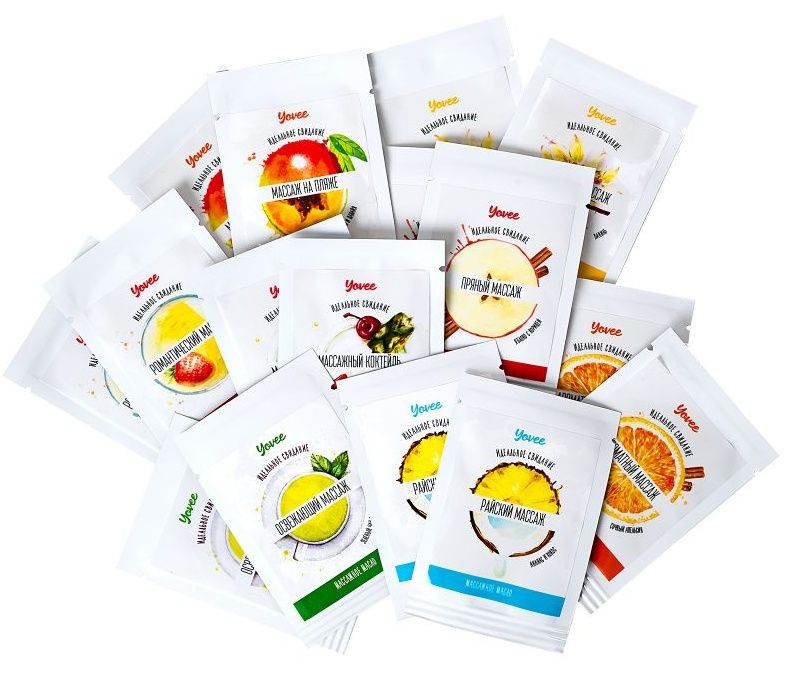 Набор пробников массажных масел Yovee. Ароматы в наборе: кокос и ананас (2 шт.), ваниль (2 шт.), манго и папайя (2 шт.), апельсин и корица (2 шт.), пина колада (2 шт.), яблоко и корица (2 шт.), зеленый чай и мята (2 шт.), клубника и шампанское (2 шт.). Натуральные масла в составе сделают массаж не только насыщенным и чувственным, но и полезным для вашей кожи. Отлично скользит и смывается водой. Подготовьтесь к свиданию: после приёма расслабляющей ванны побалуйте себя ароматным массажем. Налейте масло в ладони и легкими массажными движениями массируйте своё тело. Приятный аромат и натуральные масла в составе сделают вашу кожу приятной и мягкой.