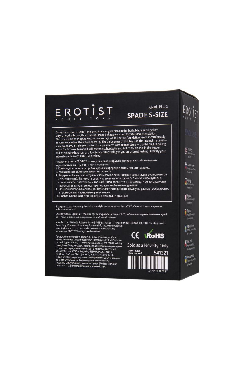Анальная втулка Spade - это уникальная игрушка, которая способна подарить удовольствие как мужчине, так и женщине. Каплевидная форма и миниатюрный размер S дарит комфортную анальную стимуляцию. Узкий скругленный кончик облегчает введение игрушки. 100% водонепроницаемость и мощная присоска в основании позволяют использовать втулку на любых гладких поверхностях, даже в ванной, а также служит надежным ограничителем. Внешний материал - нежный и безопасный силикон, а внутренний материал игрушки сделан из специальной пены, которая позволяет экспериментировать с температурой: опустите втулку в кипяток на 5-7 минут, и она станет мягкой, пластичной и горячей. Положите втулку в морозилку, и ее потрясающая твердость и низкая температура обеспечат необычные ощущения. Добавьте разнообразия и экспериментов в ваши интимные игры с девайсами EROTIST! Рабочая длина - 7 см. Минимальный диаметр - 1,4 см.