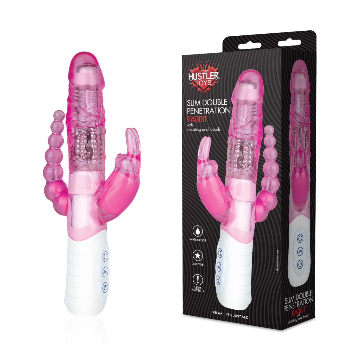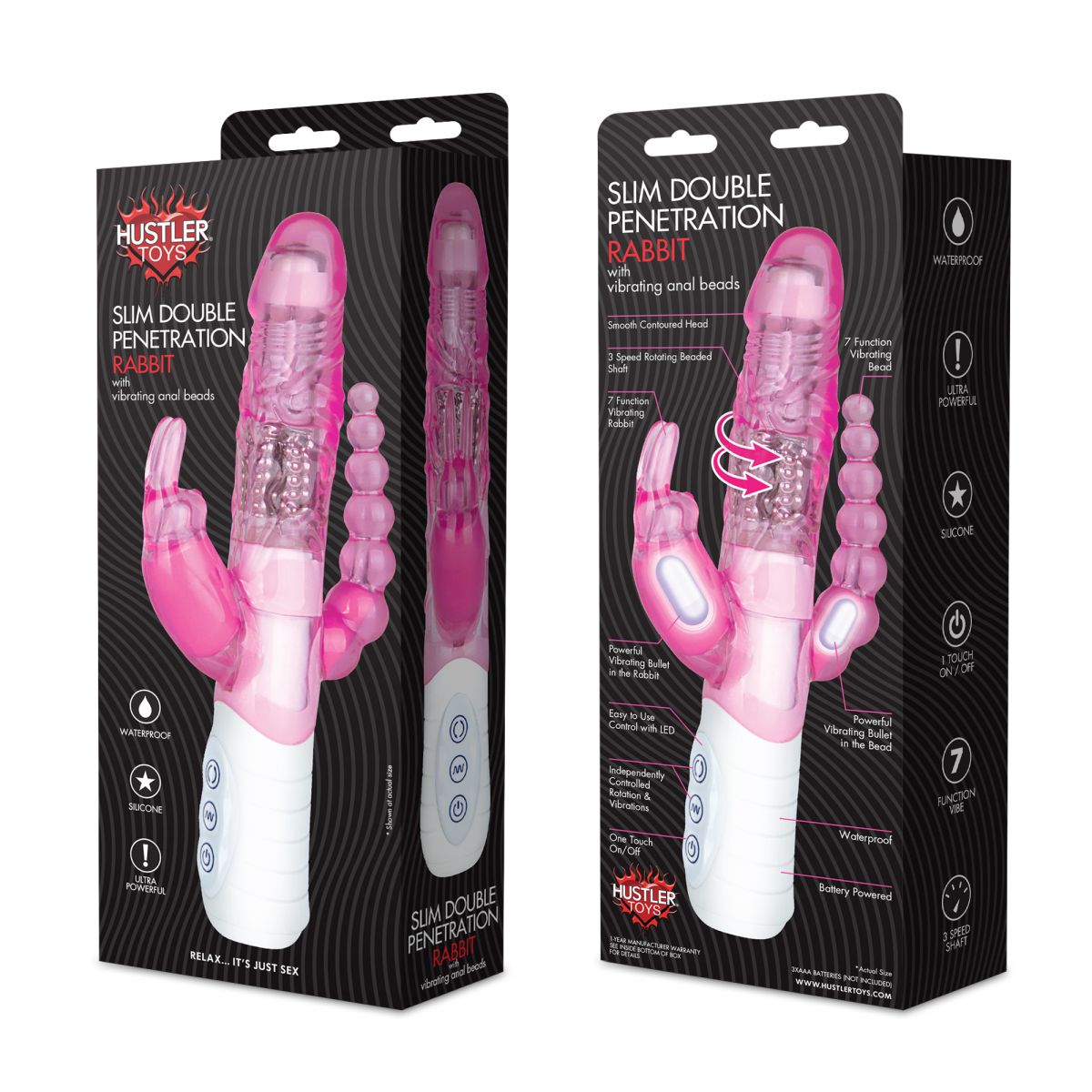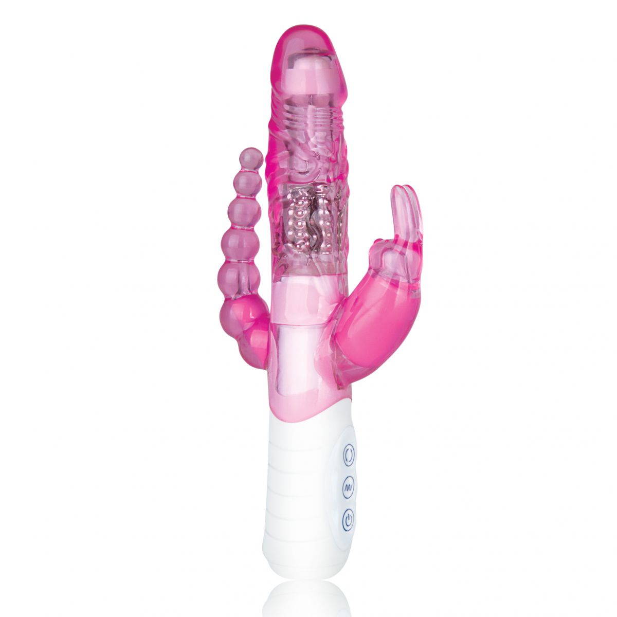 Компактный и многофункциональный вибратор розового цвета с тройной стимуляцией. Вагинальная часть с 3 скоростями ротации металлических шариков, а анальный стимулятор из круглых звеньев имеет 7 функций вибрации. Клиторальный зайчик имеет мягкие длинные ушки и фактурную мордочку с глазками и носиком, 7 режимов работы. Вибратор водонепроницаем, оснащен кнопкой быстрого выключения. Два моторчика в клиторальном и анальном стимуляторах регулируются вместе, а ротация шариков независимо от них. Длина вагинального отростка - 13 см., диаметр - 3,5 см. Длина анального отростка - 9 см., диаметр - 2 см. Батарейки в комплект не входят.